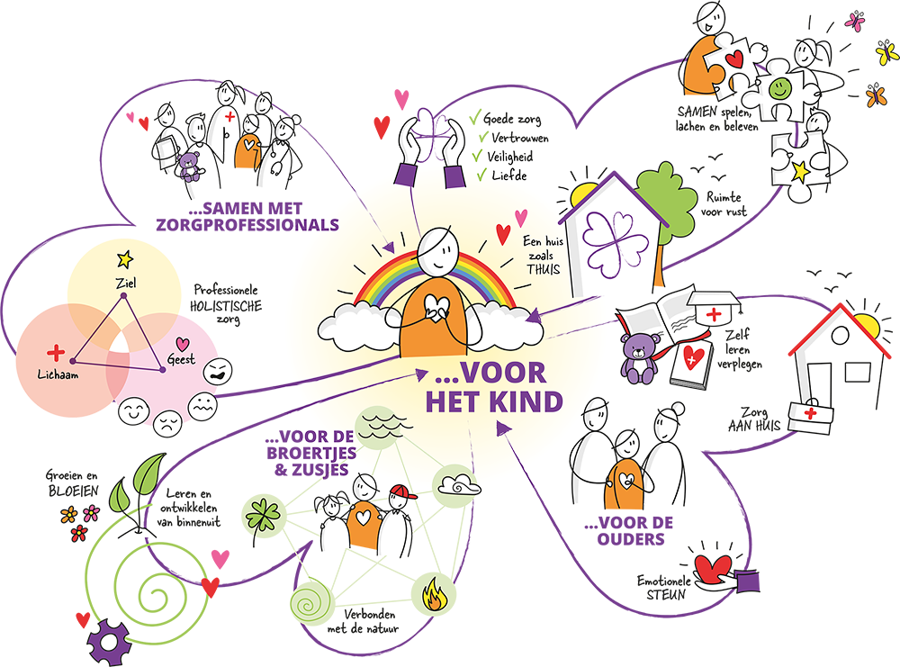We komen dan naast u staan met een luisterend oor, praktische hulp of een hand op uw schouder. Ons team van verpleegkundigen kunnen samen met jullie de zorg bieden. Samen bekijken we ieder moment wat er nodig is voor zorg, rust en plezier. Ook zijn we er voor rouw-en verliesbegeleiding, orthopedagogische advies en spirituele begeleiding.